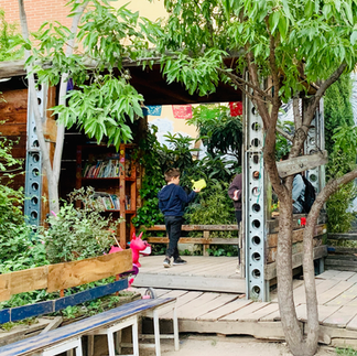 El paseo por el jardín fue delicioso. Estando en un muy céntrico y emblemático barrio popular de la ciudad, con un apretado entramado de calles y aceras estrechas, el jardín permite tener tranquilidad y compartir momentos de ocio y de socialización, para niños y adultos, en un espacio verde, donde no se oye el tráfico, y lleno de posibilidades. Allí vimos casetas con libros y juguetes, un taller de bicicletas, un pequeño auditorio, algún columpio, bancos y mesas para comer o tomar algo juntos, y el huerto y el resto de diseños vegetales.